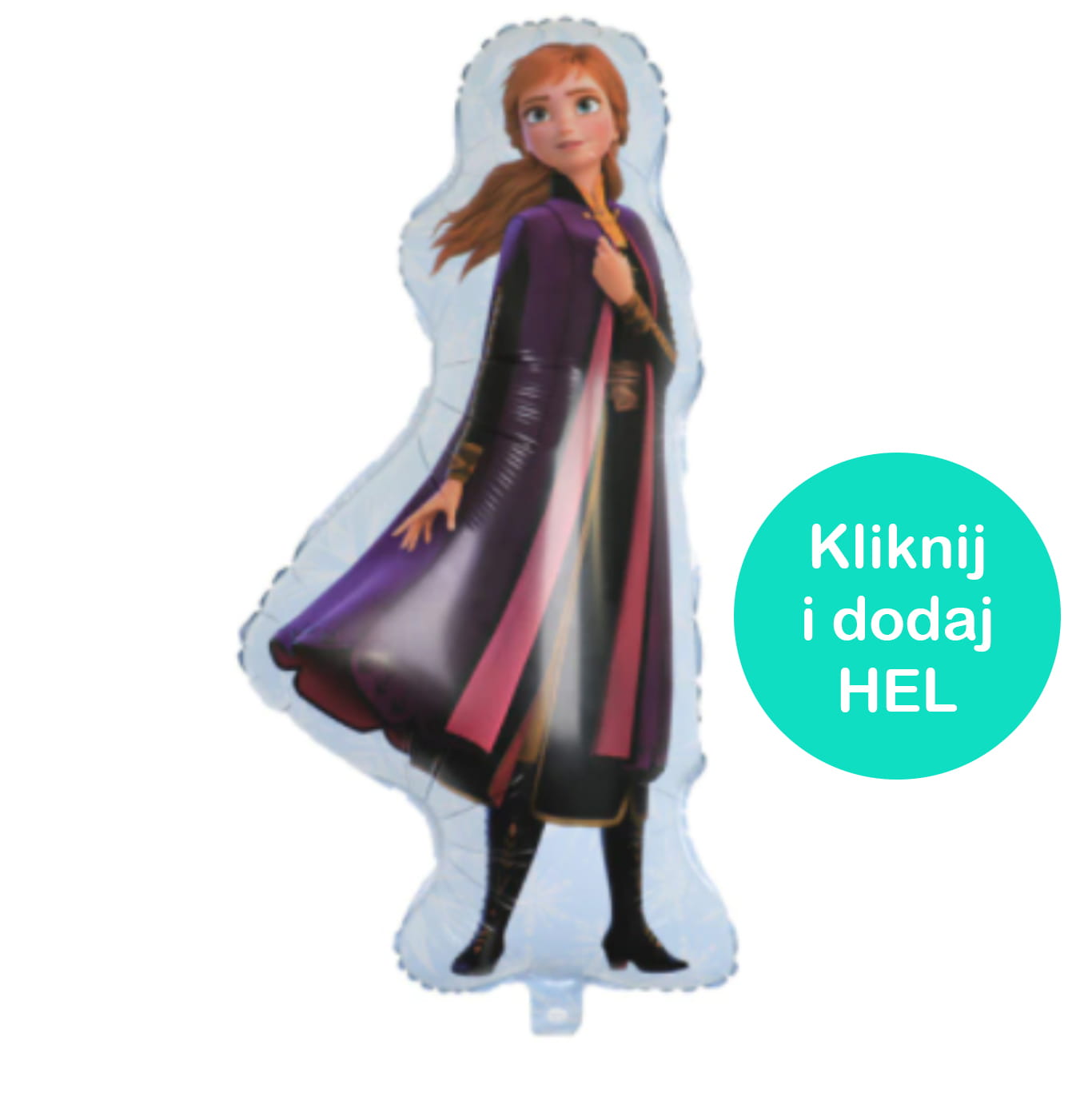 Przepiękny balon foliowy w kształcie Anny z Krainy Lodu 2 o wymiarach 85x50 cm (przed napompowaniem, po napełnieniu helem lub powietrzem wielkość możne nieznacznie się zmienić).