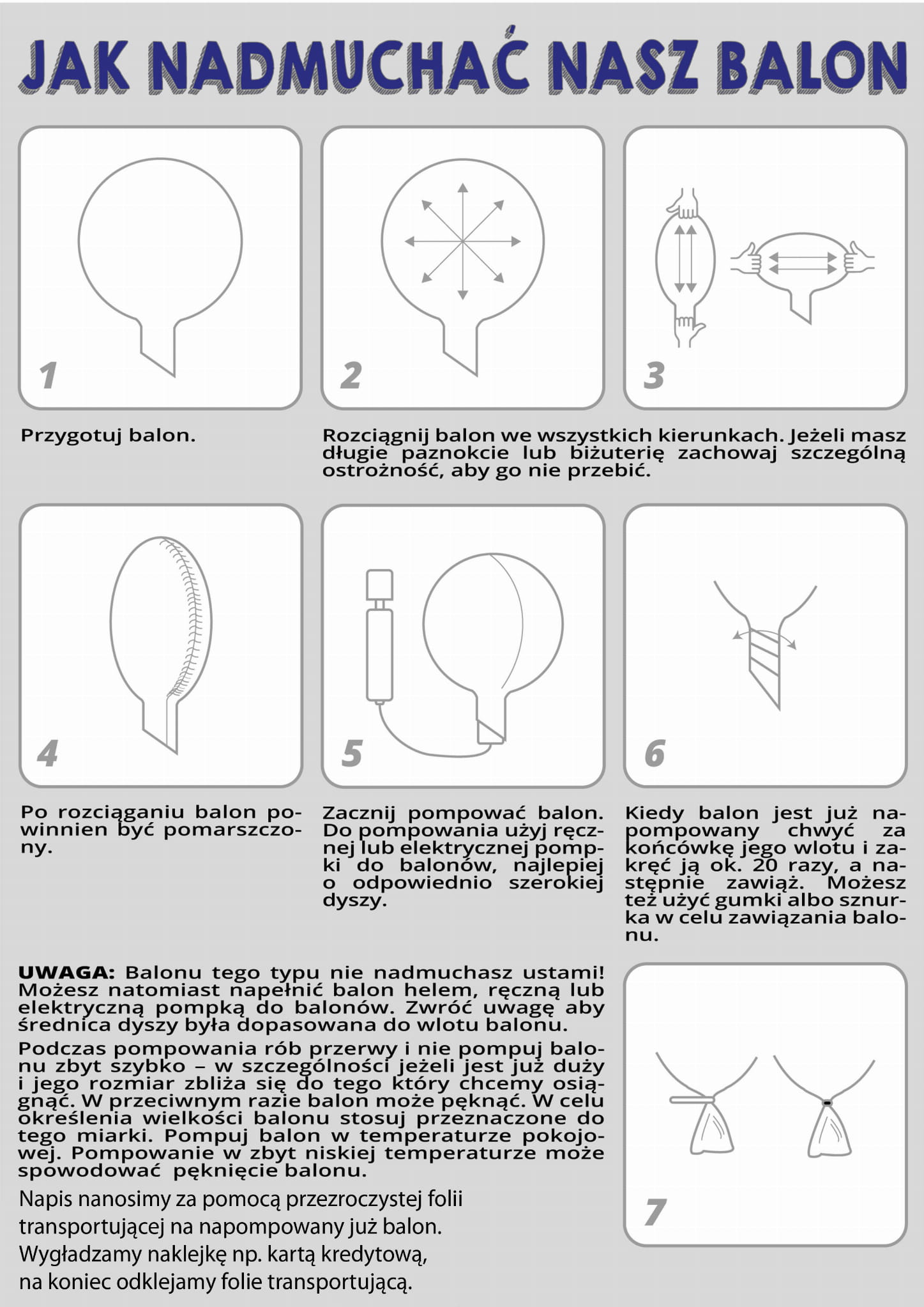 Pompowanie tego balona jest specyficzne, przed napełnieniem helem lub powietrzem balon należy dokładnie porozciągać w każdym kierunku równomiernie, tak aby po napompowaniu był idealną kulą. Do nadmuchania balona niezbędna jest pompka lub butla z helem. Uwaga: Napełnienie ich powietrzem spowoduje, że balony nie będą się unosić. Balon napełniony powietrzem można zamocować na patyczku lub stojaku do balonów.