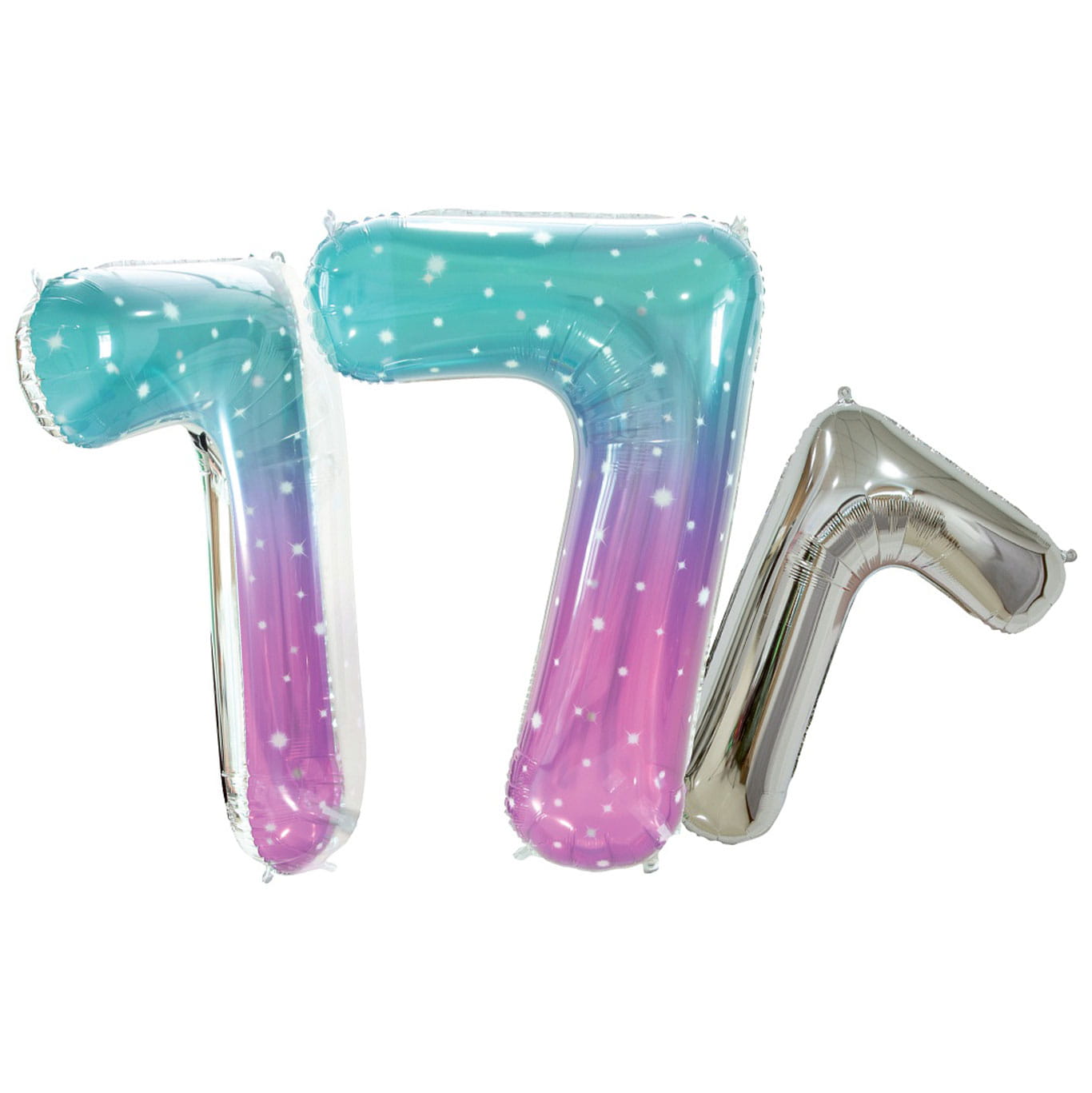 Balon wyprodukowany z najwyższej jakości folii w wyjątkowym kolorze ombre fioletowo turkusowa z gwiazdkami a całość zamknięta w transparentnej bańce z tyłu srebrna.