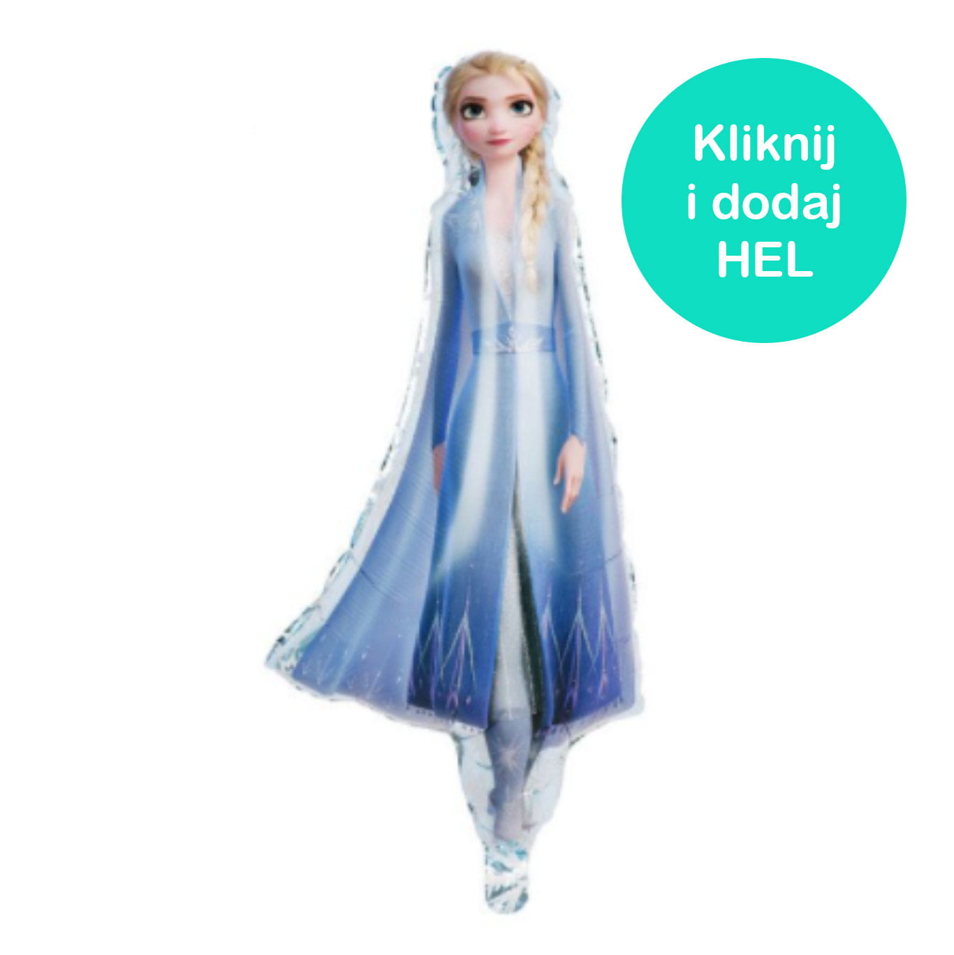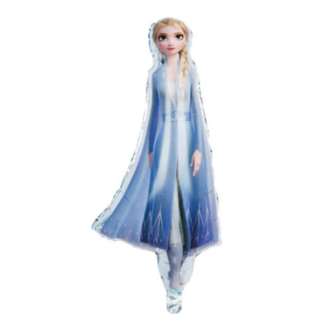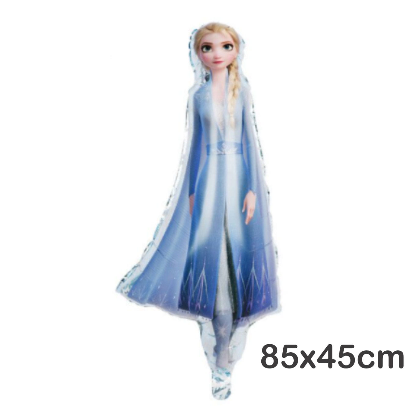Przepiękny balon foliowy w kształcie Elzy z Krainy Lodu 2 o wymiarach 85x45 cm (przed napompowaniem, po napełnieniu helem lub powietrzem wielkość możne nieznacznie się zmienić). Nadruk dwustronny (jedna strona postać Elzy z drugiej bardzo ładne białe kryształki śniegu w kształcie gwiazdek na niebieskim tle).