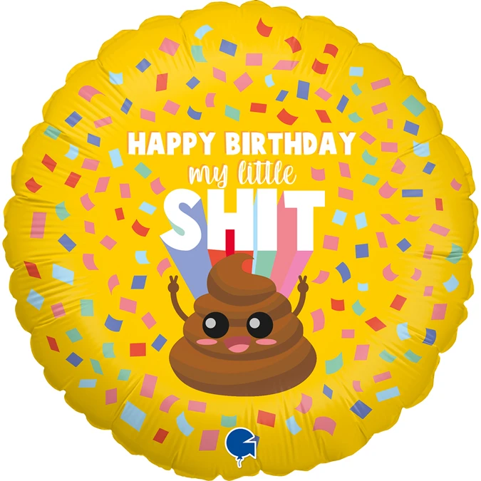 Balon wyprodukowany z najwyższej jakości folii z nadrukiem kupy i napisem "Happy Birthday My Little Shit"..