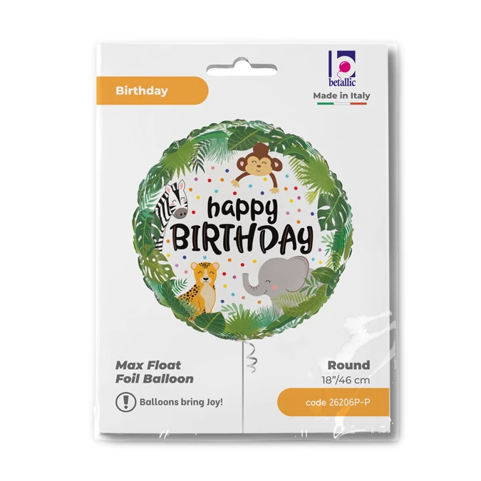 Balon wyprodukowany z najwyższej jakości folii z nadrukiem małpki, zebry, geparda i słonika i napisem "Happy birthday".
