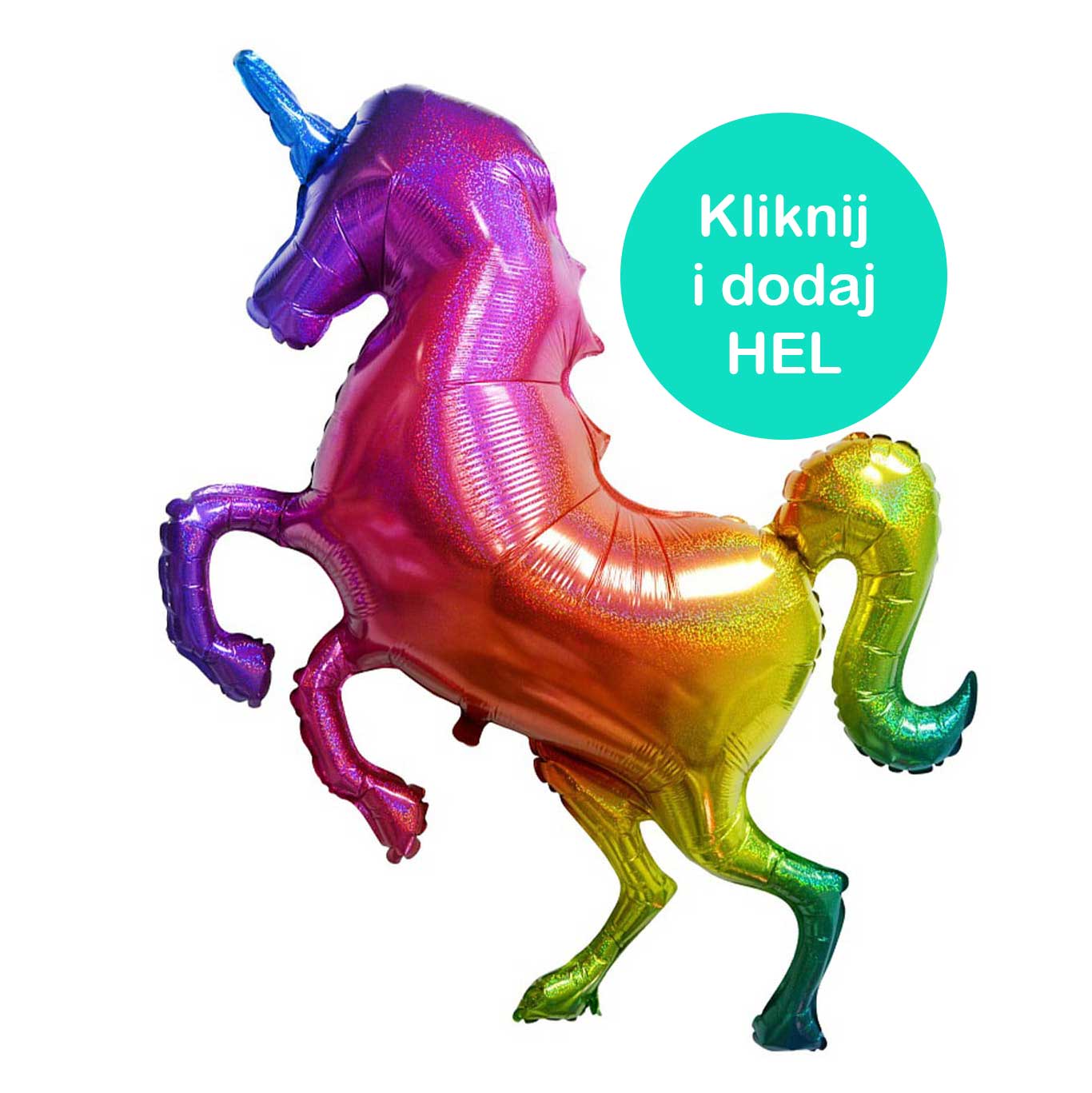 Balon foliowy w kolorze holograficznej tęczy w kształcie dużego Jednorożca o wymiarach 70x135 cm.