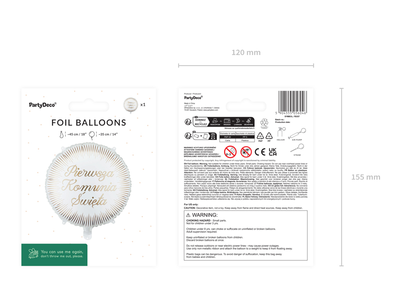 Biały okrągły balon z matowej foli z napisem Pierwsza Komunia Święta w kolorze metalizowanego złota oraz pięknie zdobiony w złote metalizowane promienie skupione dookoła napisu.