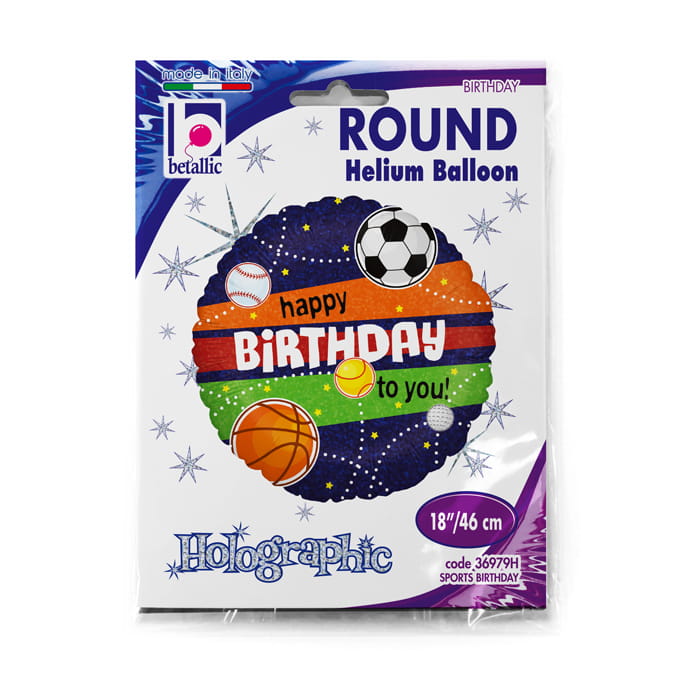 Okrągły balon wyprodukowany z najwyższej jakości folii firmy Grabo z nadrukiem piłki do koszykówki, piłki nożnej, tenisa, hokeja i baseballu z napisem Happy Birthday to you.