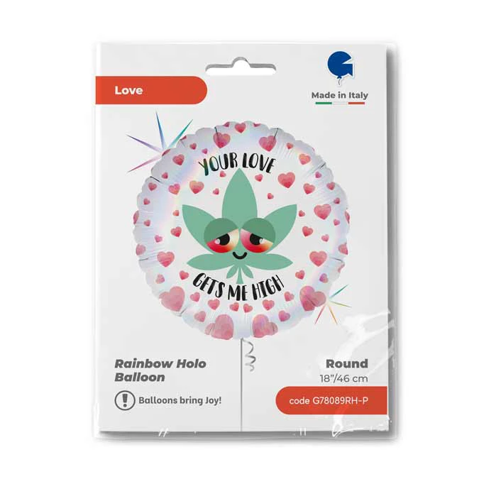 Balon wyprodukowany z najwyższej jakości folii z nadrukiem liścia konopii i napisem "Your Love Gets Me High".