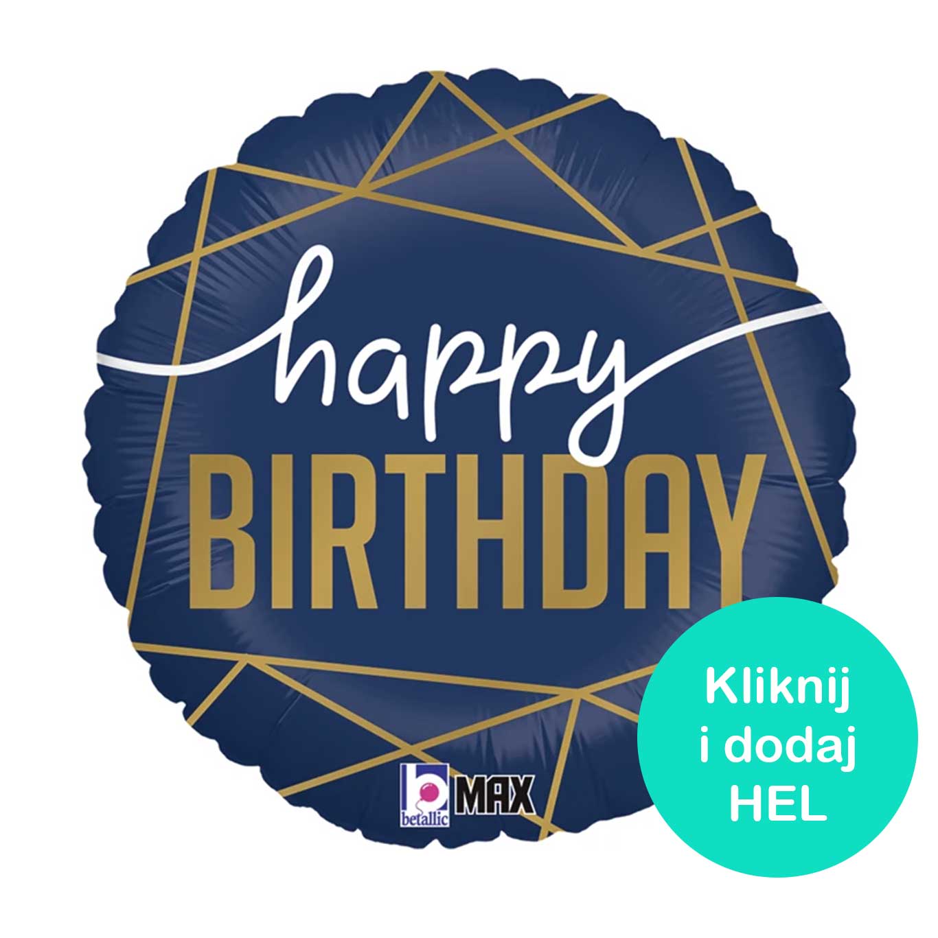 Piękny granatowy, metalizowany okrągły balon foliowy ze złoto-białym napisem Happy Birthday.