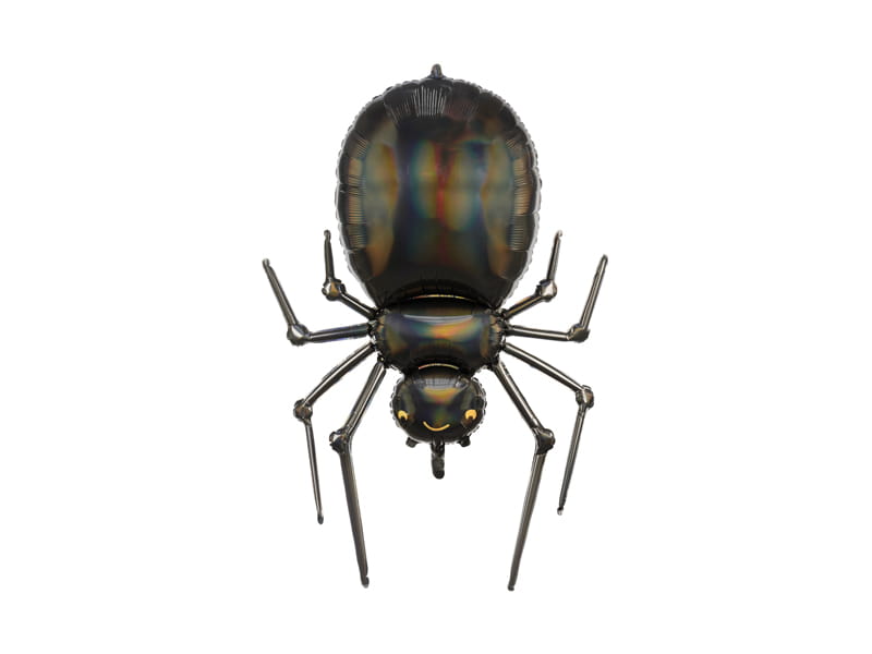Błyszczący balon foliowy Pająk w kolorze czarnym ze złotym metalizowanym nadrukiem, wymiary ok. 60 x 101 cm (23.5 x 39.5 ''). Dostępny w 2 wariantach do wyboru: bez helu i napełniony helem.