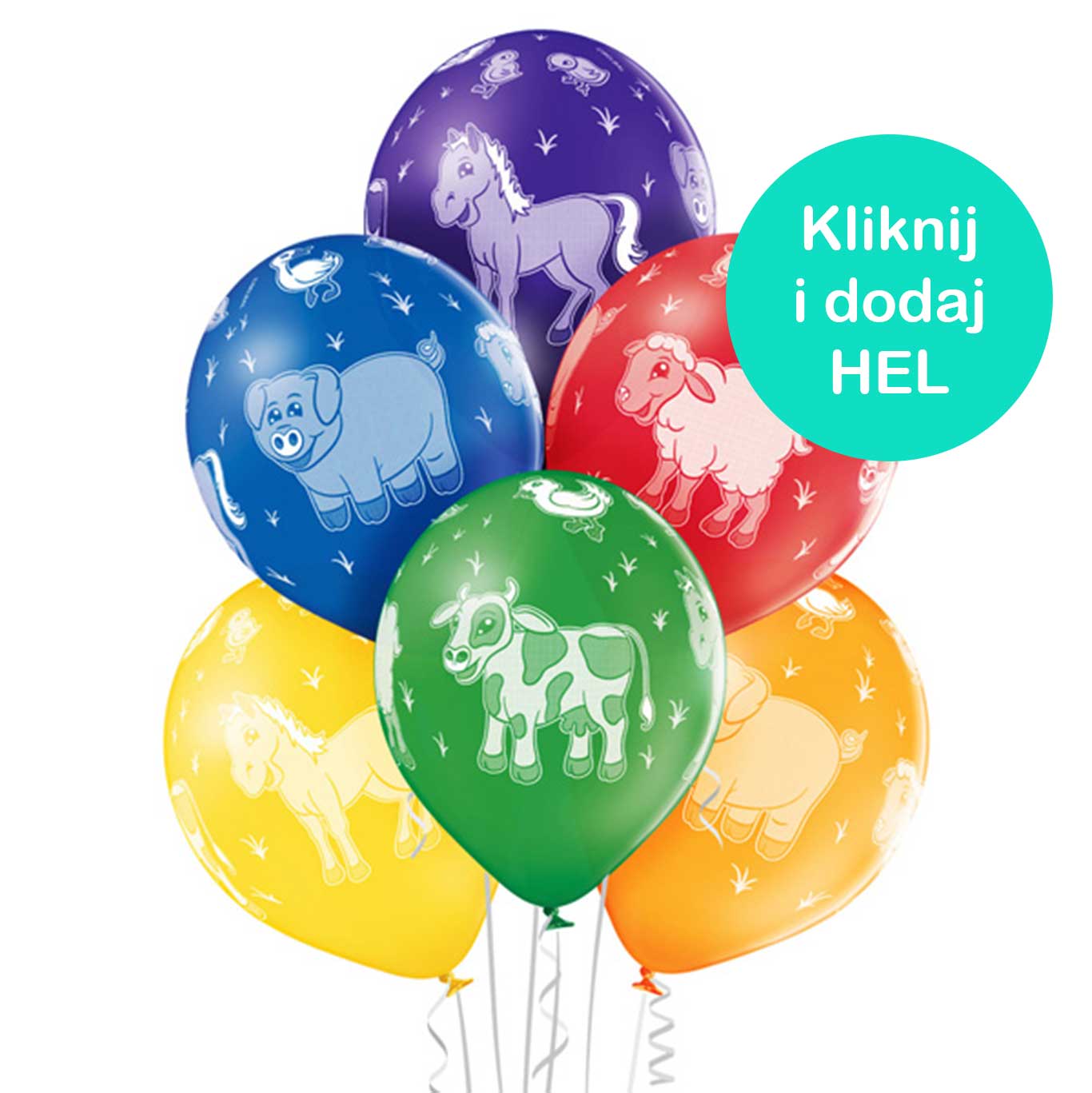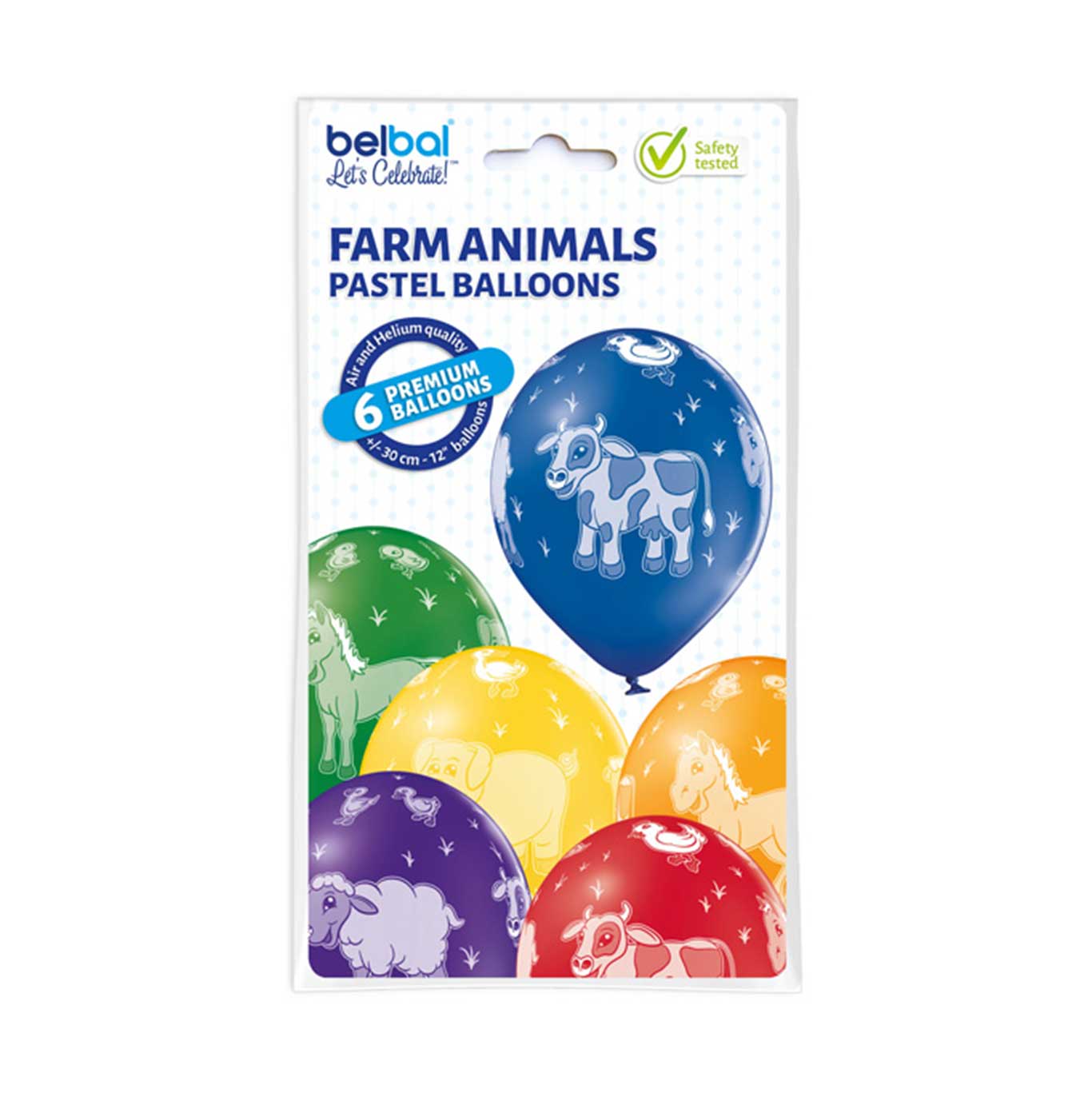 Przepiękne balony lateksowe Belbal z serii Premium Line, Zwierzątka z Farmy w kolorach pastelowych niebieskim, granatowym, czerwonym, zielonym, pomarańczowym i żółtym pakowane po 6 szt.