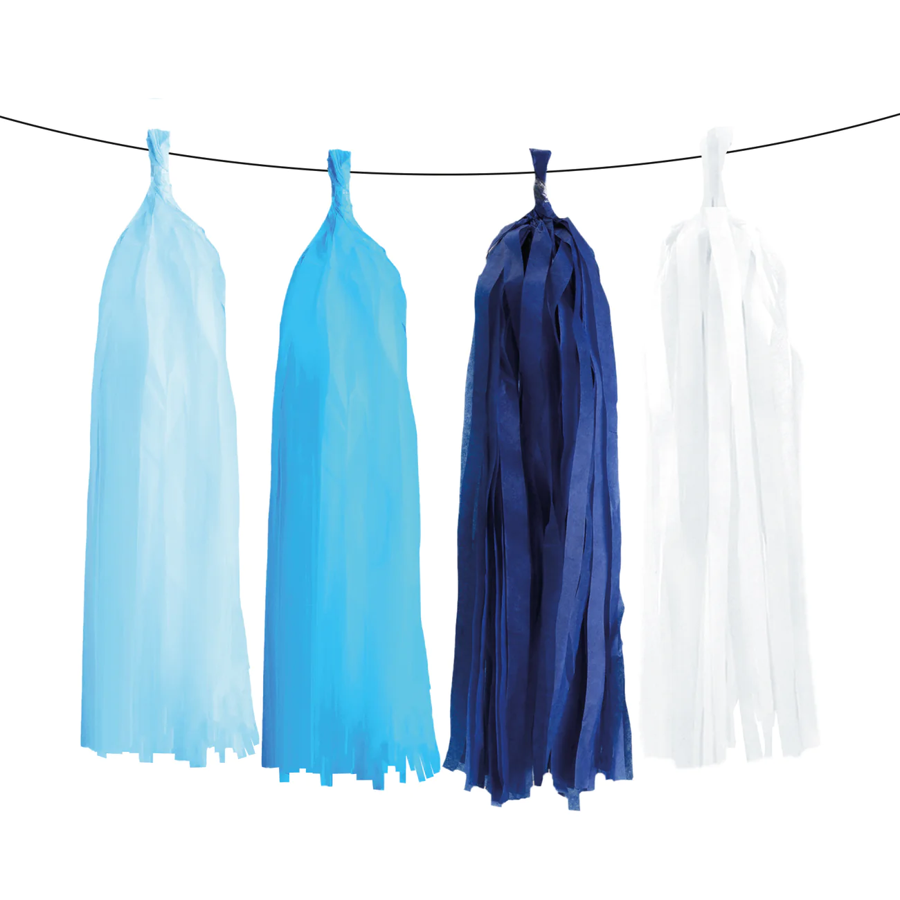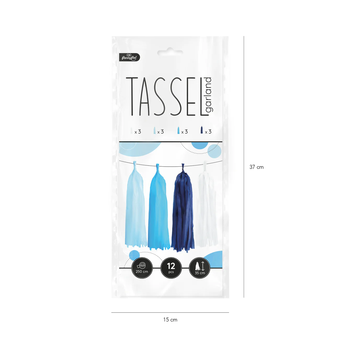 W komplecie 3 szt. frędzli białych, 3 szt. błękitnych, 3 szt. niebieskich oraz 3 szt. granatowych