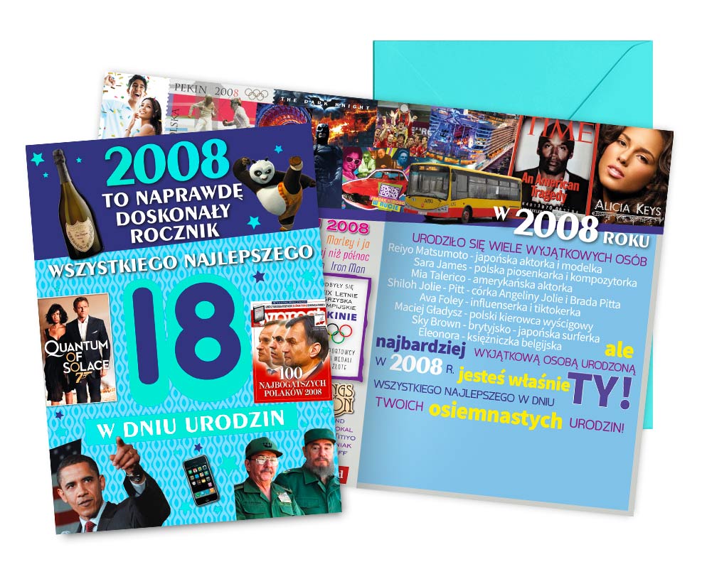 Kartka 18 Urodziny Wydarzenia z Rocznika 2008 Niebieska