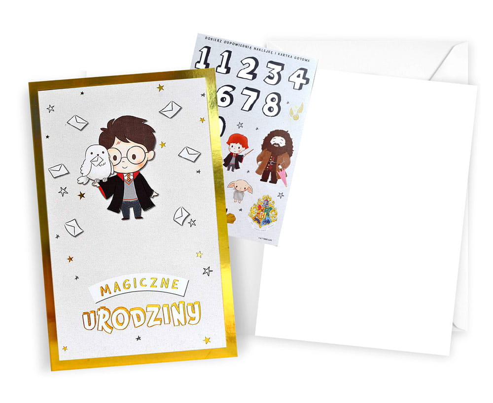 Kartka "Magiczne urodziny" z serii Harry zdobiona jest metaliczną folią, kolorowa w środku i na zewnątrz, z białą kopertą w zestawie oraz z naklejkami z cyframi i postaciami z Harrego Pottera.