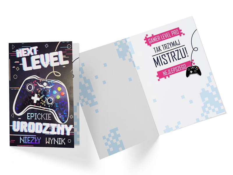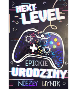 Kartka w kolorze granatowym przedstawiająca joysticka wraz z napisem "Next level, niezły wynik! Epickie urodziny".