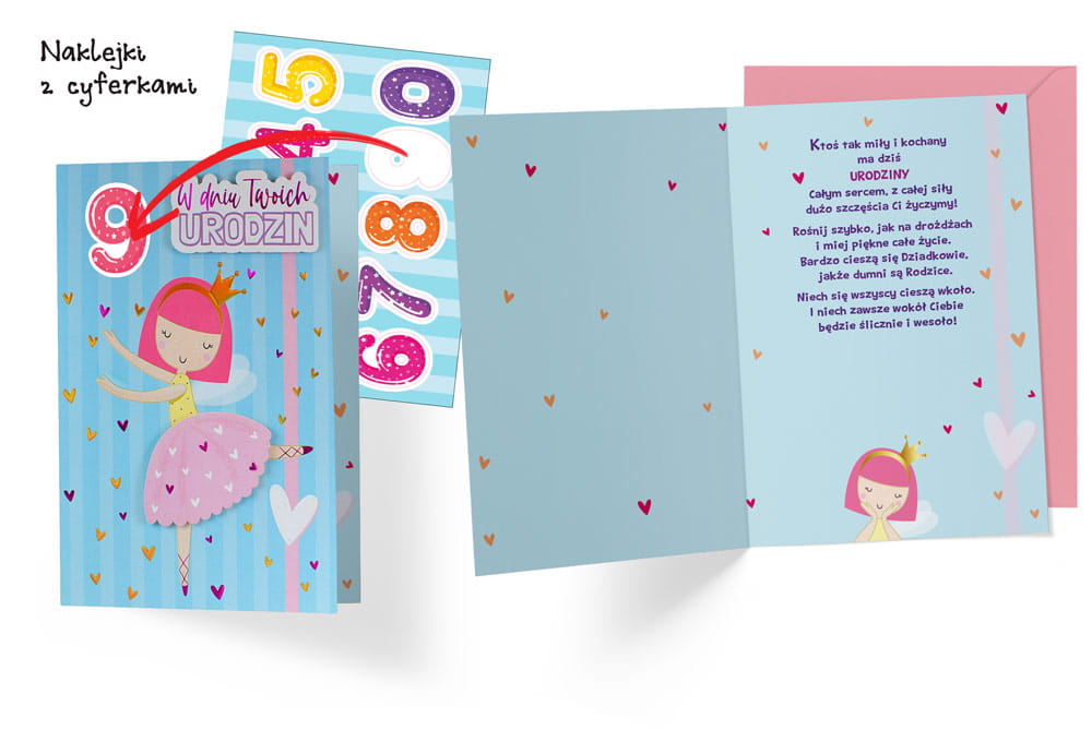 Karnet Urodziny z motywem Księżniczki/Baletnicy z wymiennymi cyferkami w powiększonym tzw. Angielskim formacie 140x190 mm.