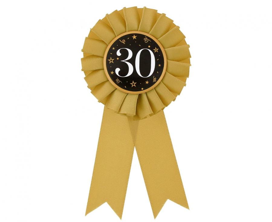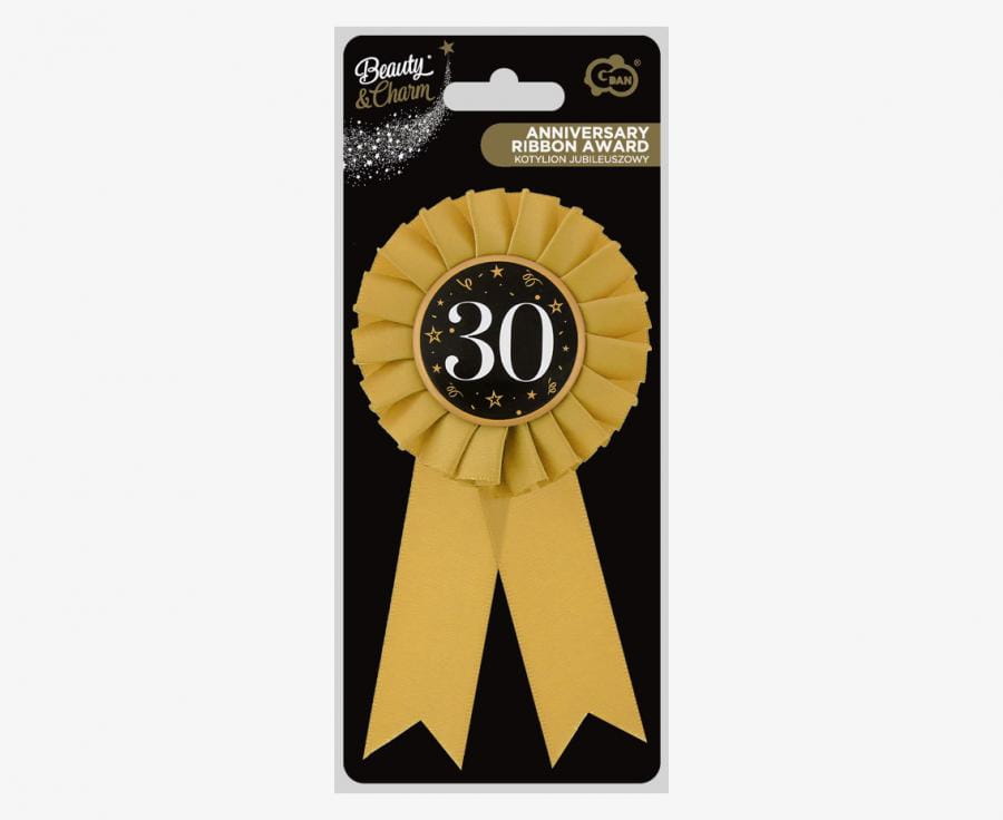 Złota przypinka z białym nadrukiem 30 na czarnym tle