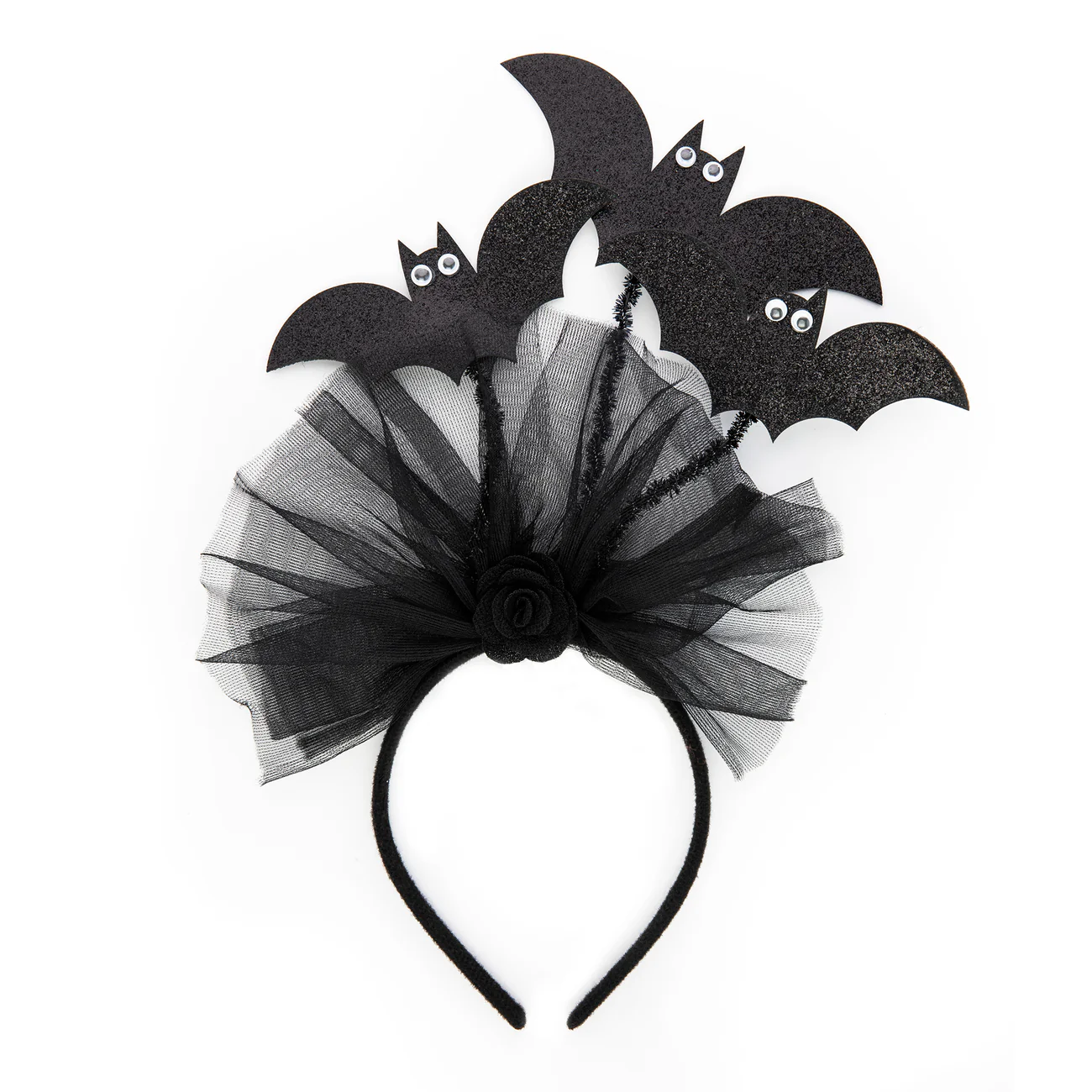 Na tej niezwykłej opasce na głowę wiele się dzieje. Czarny diadem z tiulu ozdobiony małą różyczką zadowoli każdą elegancką czarownicę, natomiast trzy czarne nietoperze nie pozostawią wątpliwości czyją głowę wieńczy opaska.