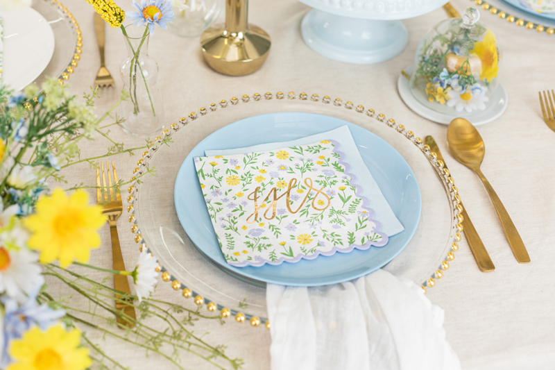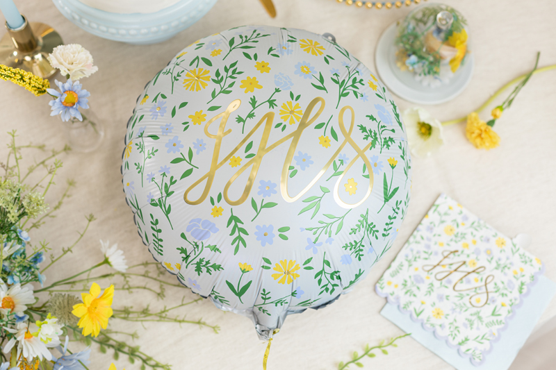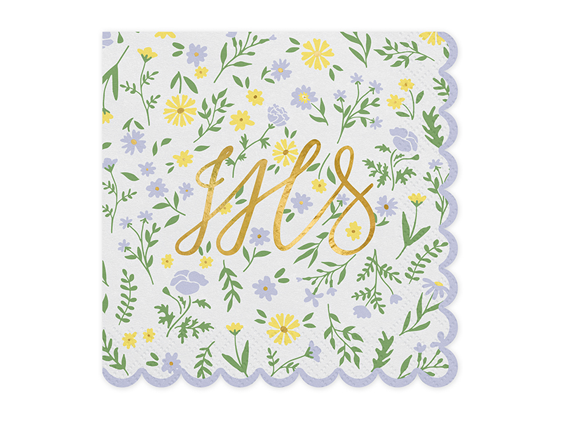Jednorazowe Serwetki papierowe z dużym złotym metalizowanym napisem IHS oraz ze zdobieniami w kwiatuszki, listki i łodygi.