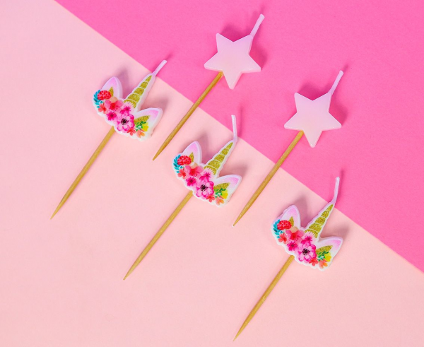 Prezentowane świeczki pikery w kształcie różowych jednorożców i gwiazdek zostały wykonane z wysokiej jakości kolorowej parafiny.