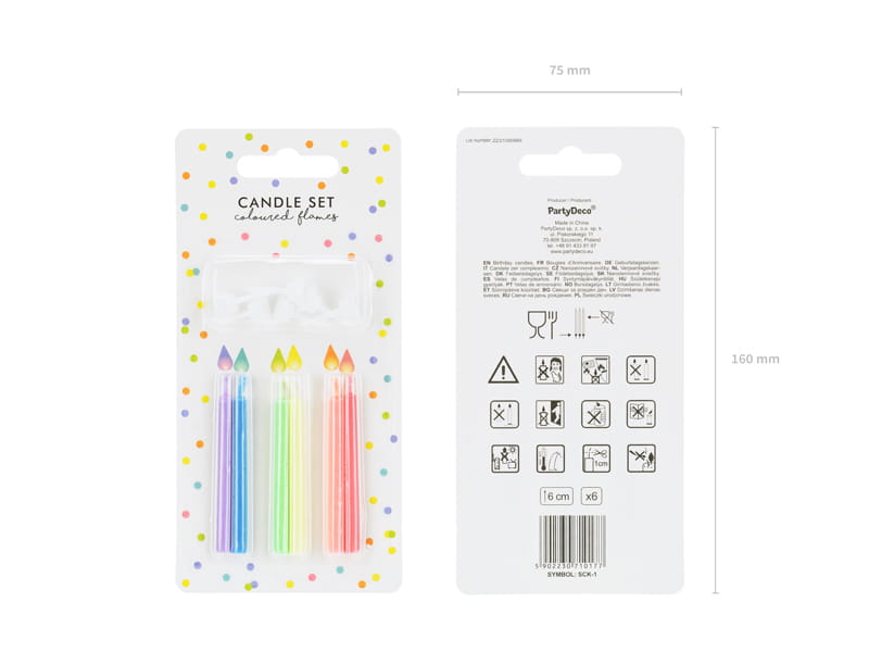 W opakowaniu zawarte są 6 świeczki: niebieskie, fioletowa, czerwona, pomarańczowa, żółta, zielona oraz 6 podstawek do świeczek.