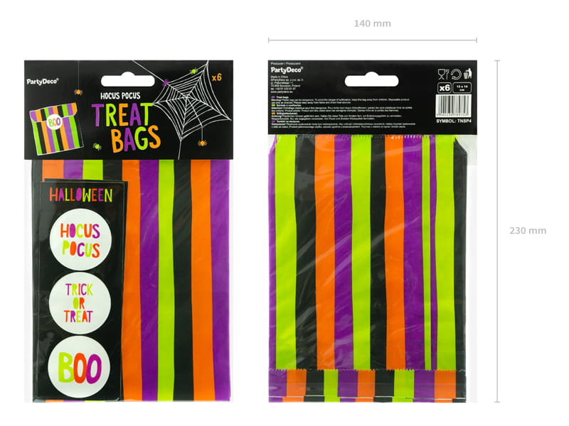 Torebki na słodycze Hocus Pocus, zestaw zawiera 6 torebek z nadrukiem i 6 naklejek, wymiary po złożeniu ok. 13 x 14 cm.