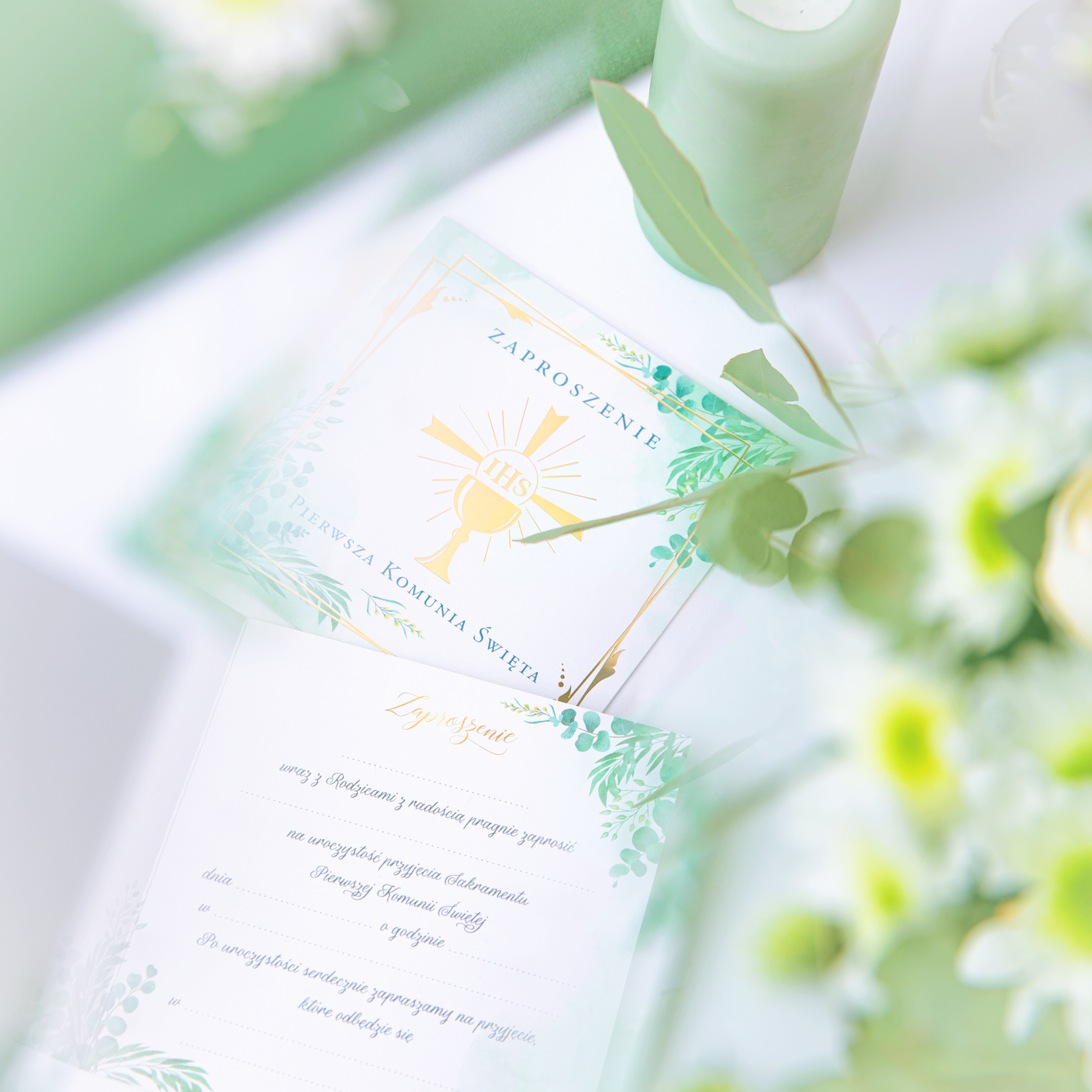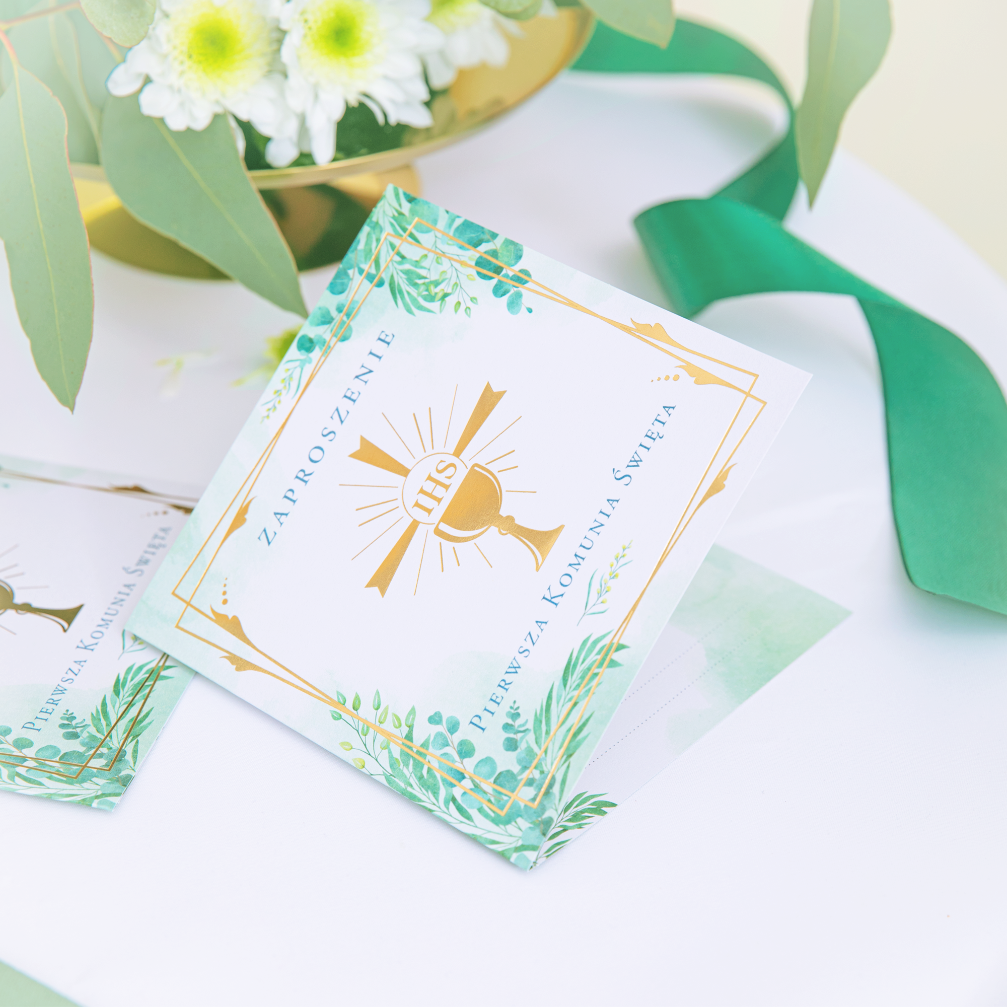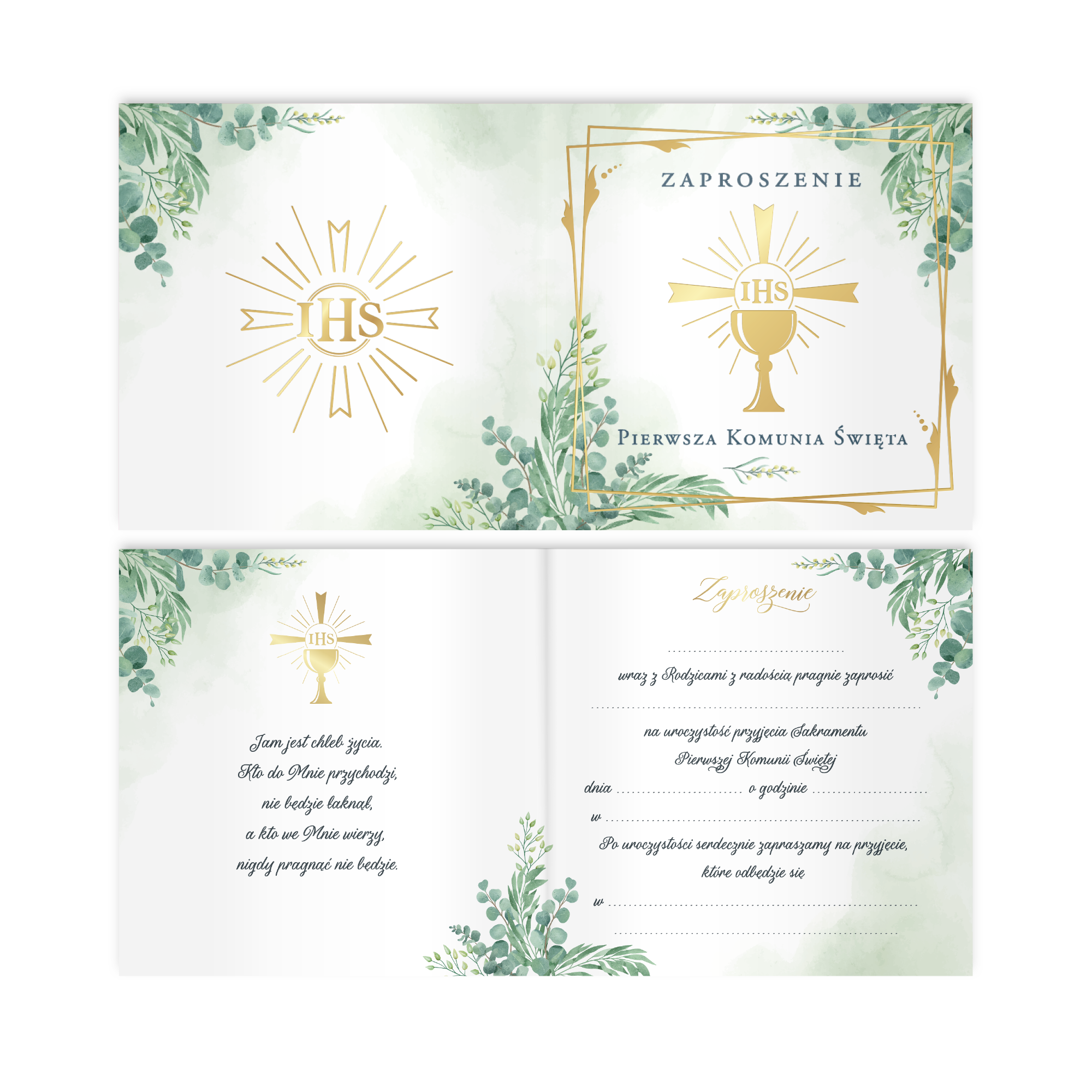 Głównym motywem na zaproszeniu jest złoty kielich z napisem IHS z delikatnymi, zielonymi gałązkami eukaliptusa w rogach.