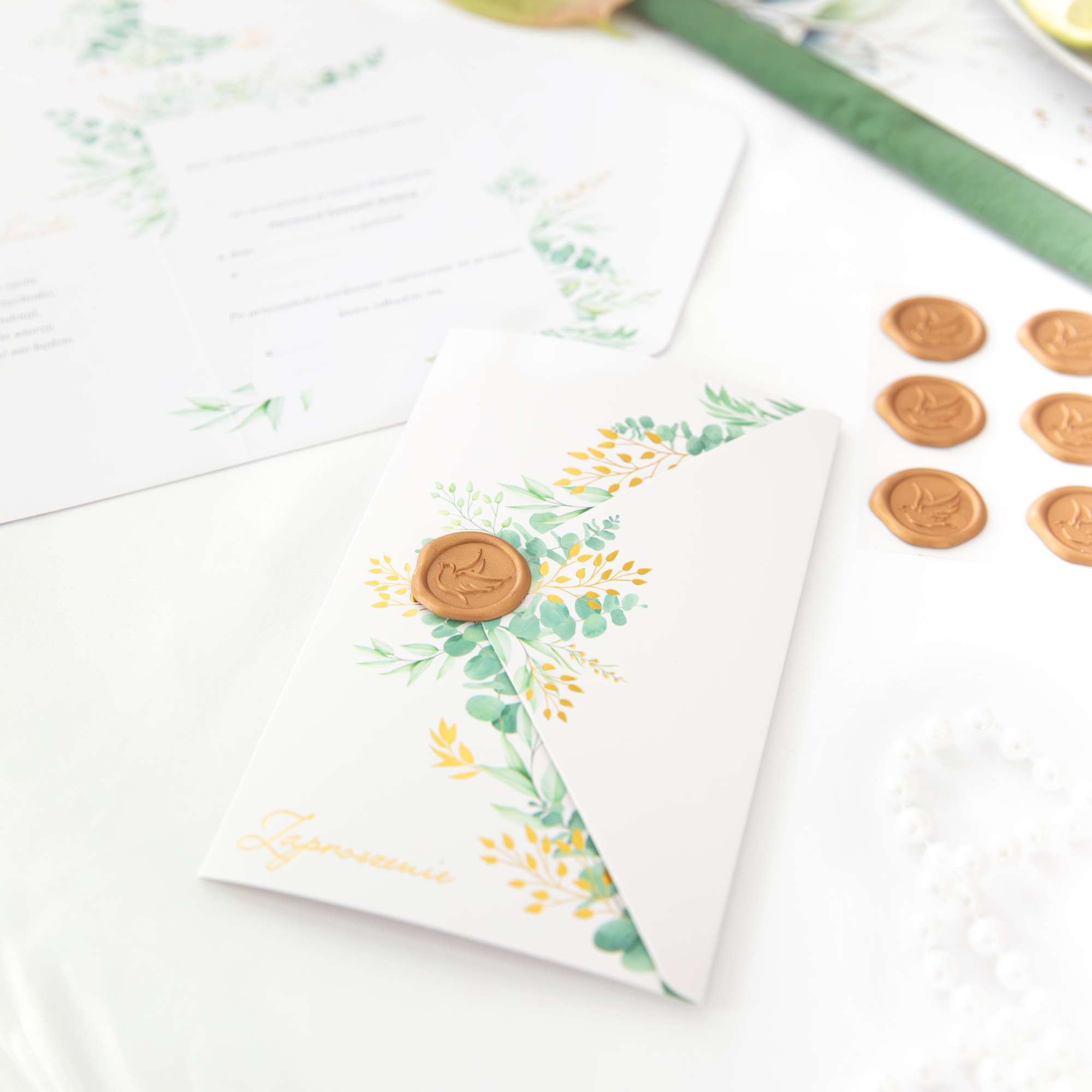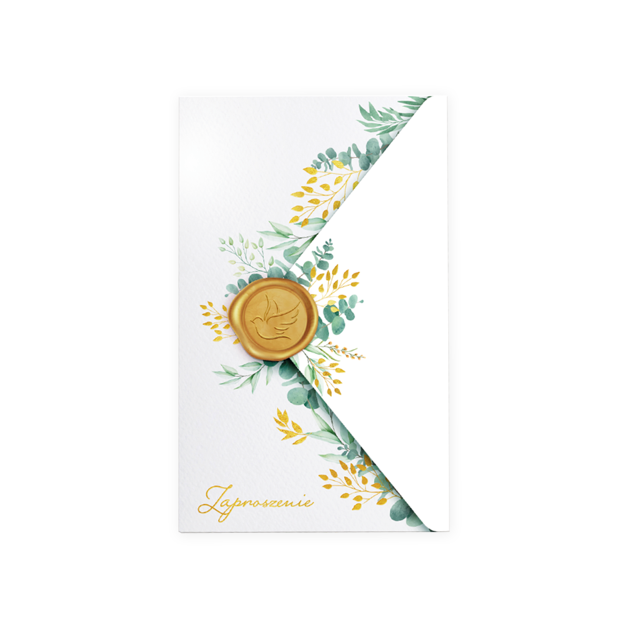 Głównym motywem na zaproszeniu jest złoty lak z wybitym gołąbkiem, zielonymi gałązkami eukaliptusa oraz elementami złoconymi z napisem "Zaproszenie" całość tworzy przepiękną kopertę.