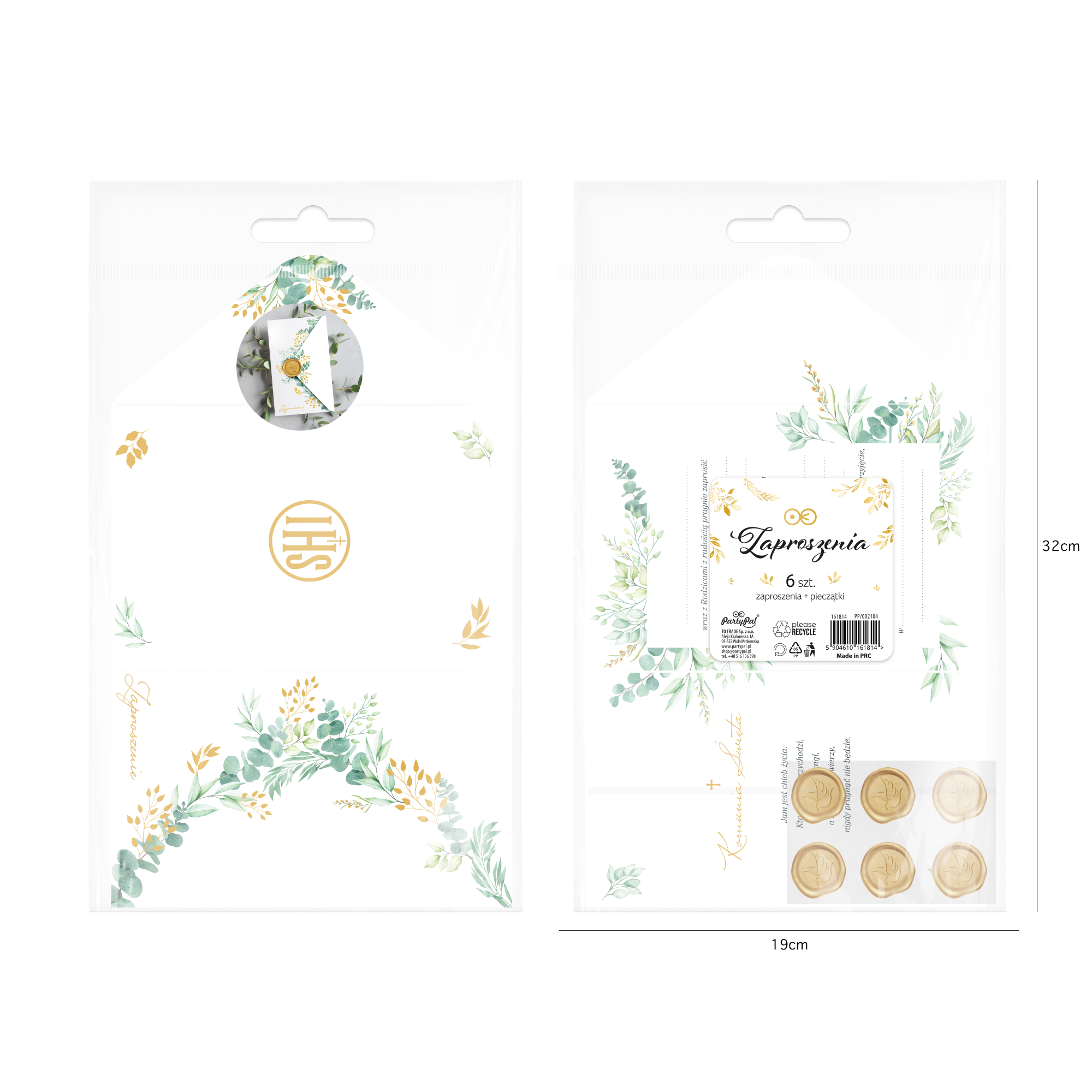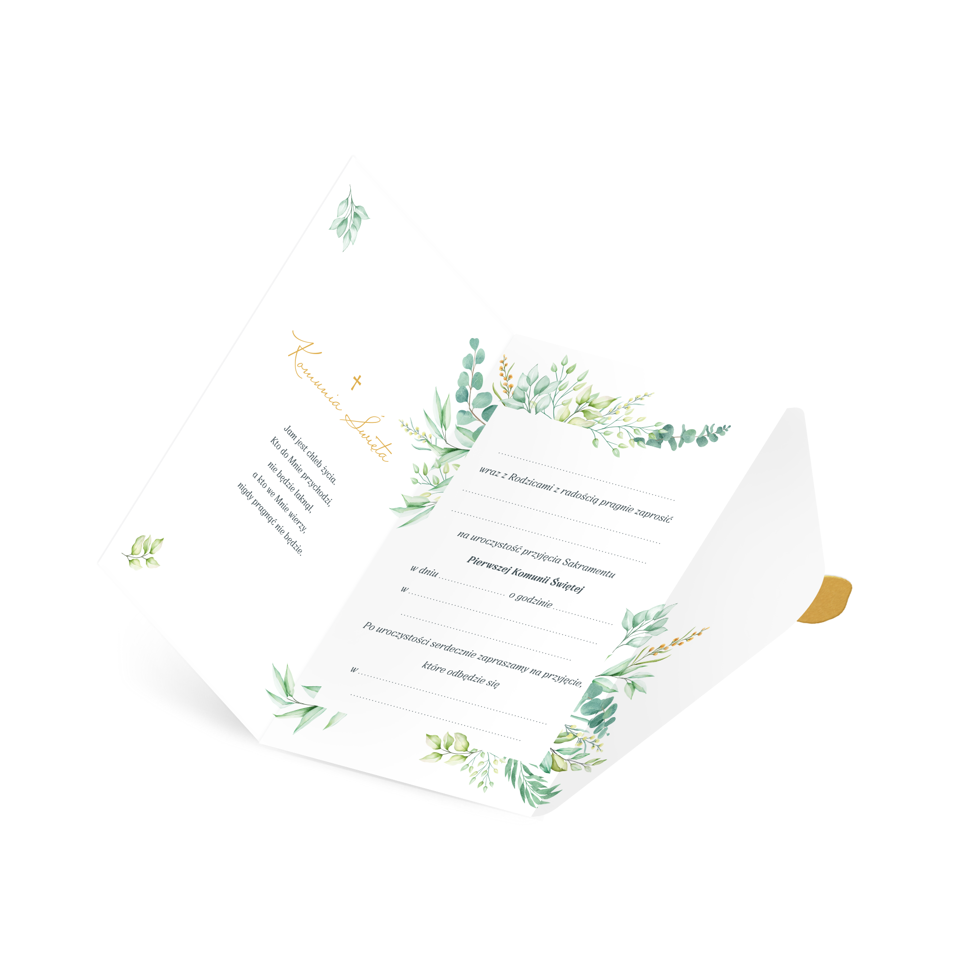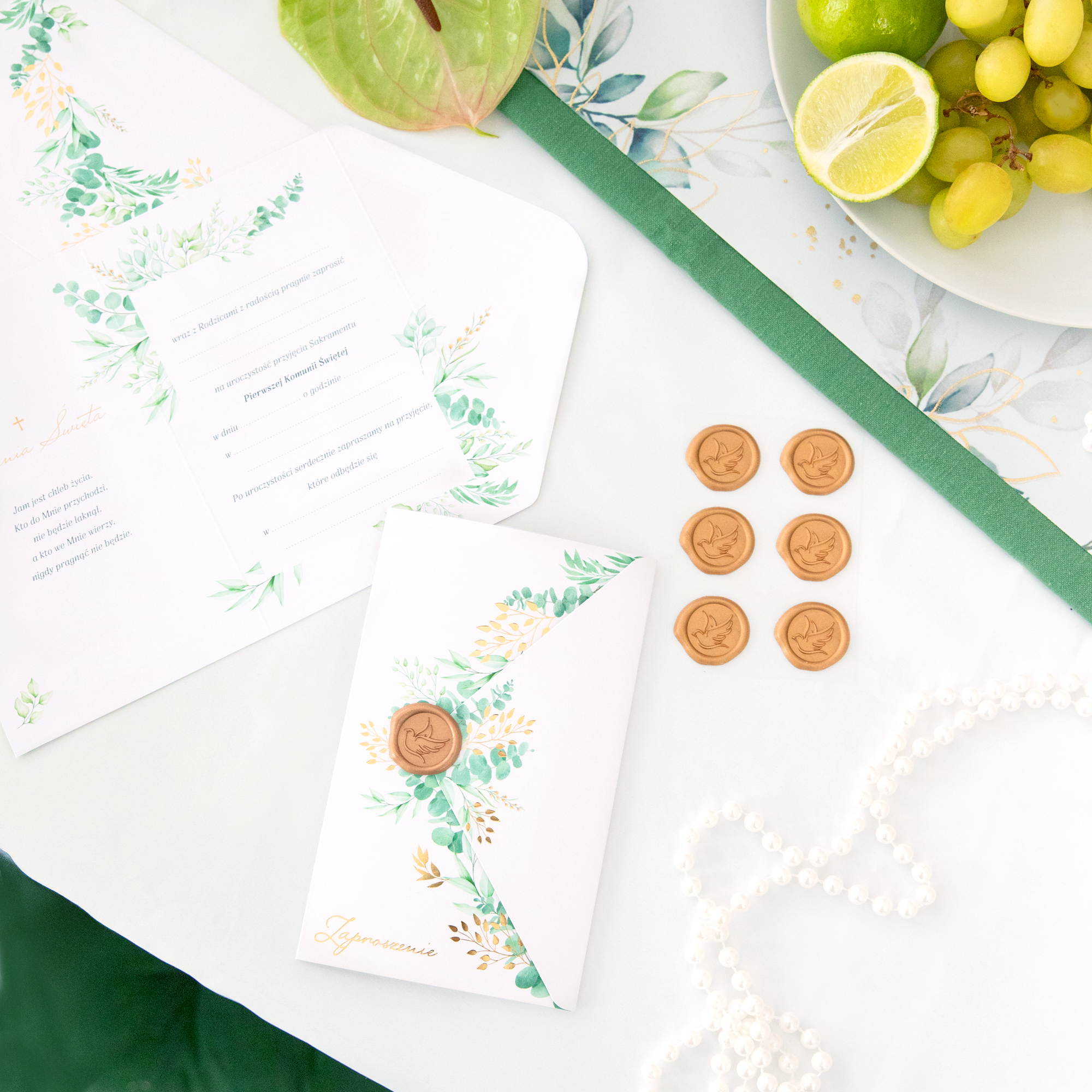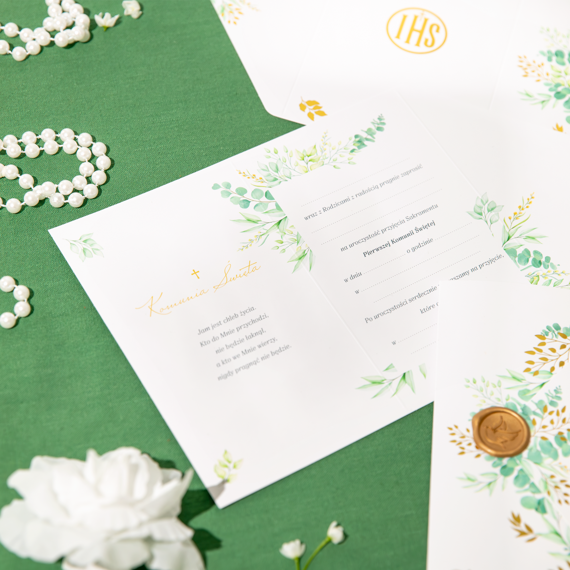 Zaproszenie Komunia Święta Eukaliptus z pieczęcią lakową 6 szt